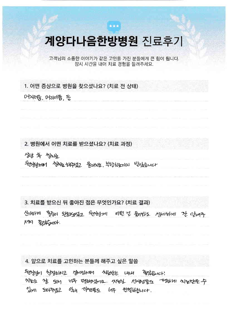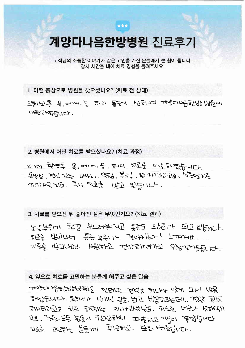 교통사고 후 목 허리 어깨 등 심한 통증 한결 나아졌어요