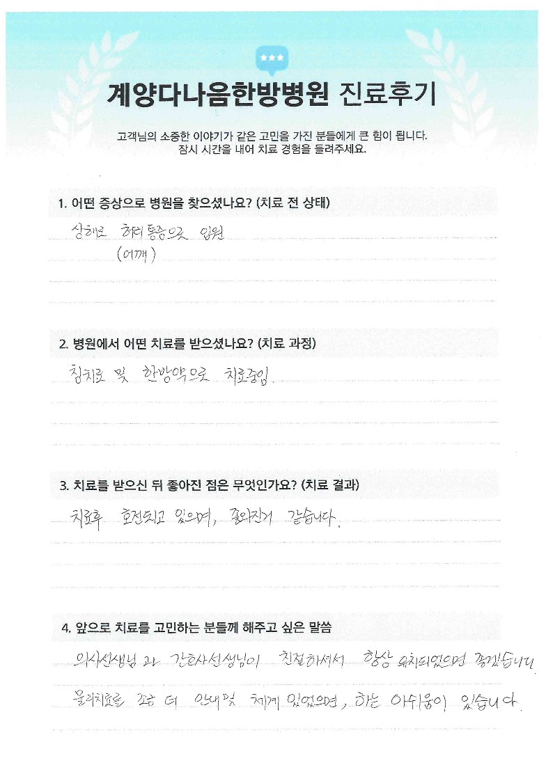 허리, 어깨 통증으로 입원치료 (환자수기)