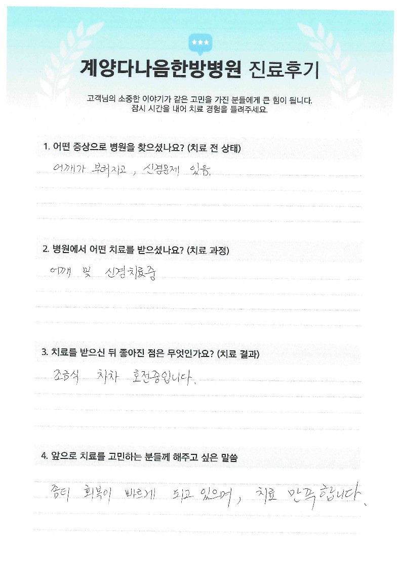 어깨 신경치료 중이며 회복이 빠르게 되고 있으며 만족합니다.