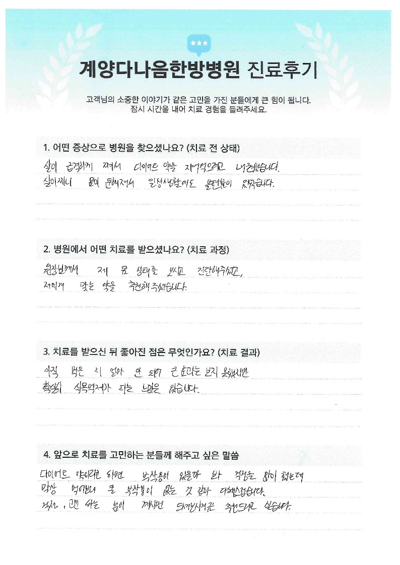 급격하게 몸무게가 늘어 다이어트 관리를 위해 내원(환자수기)