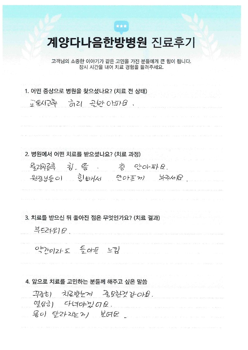 허리통증, 관절 통증으로 인해 내원 (환자수기)