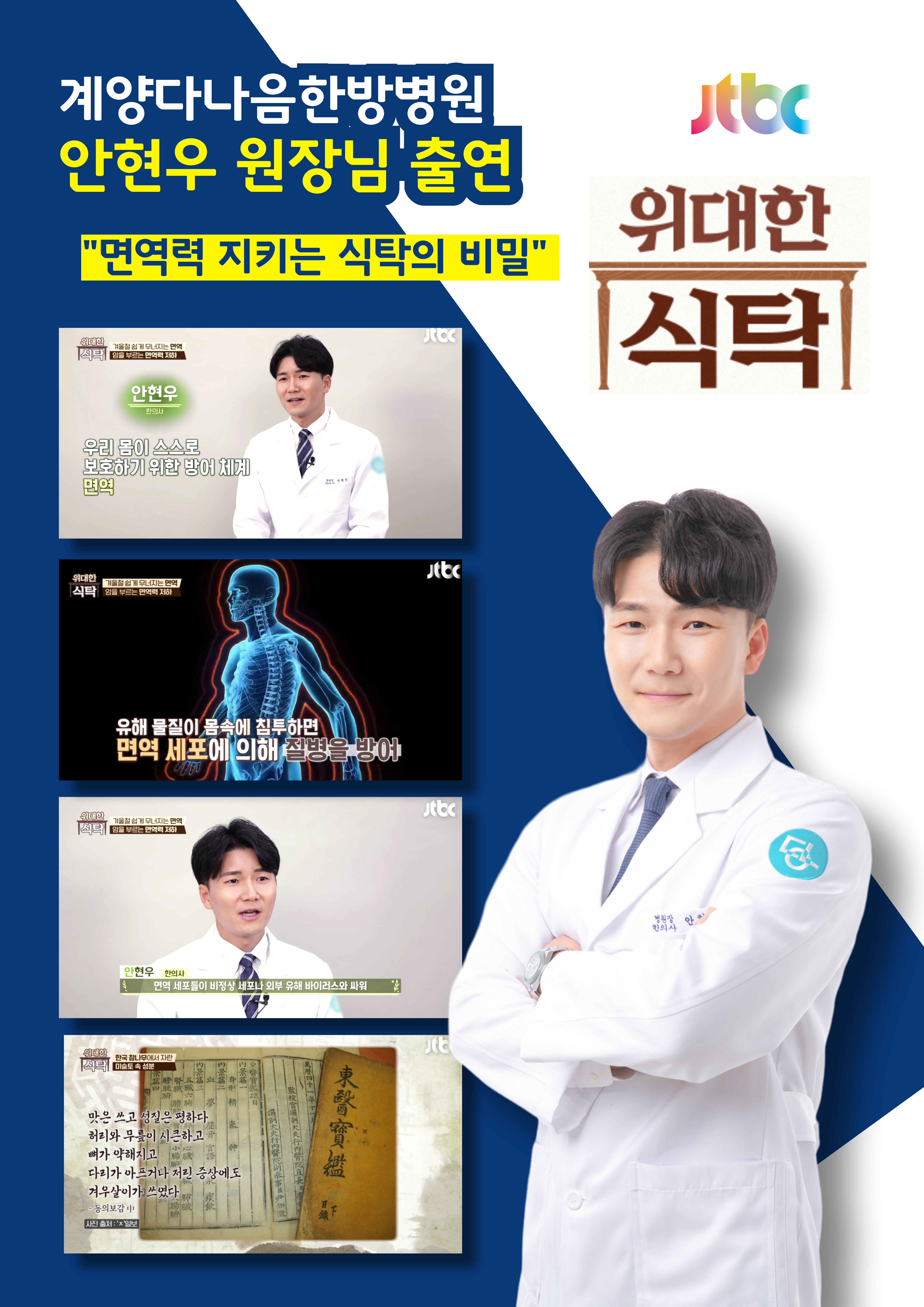 2023년 12월 23일 JTBC [위대한 식탁] 방송에 안현우 병원장과 박종률 원장이 각각 출연하여 면역력과 미슬토의 한의학적 효능에 대해 소개하였습니다.