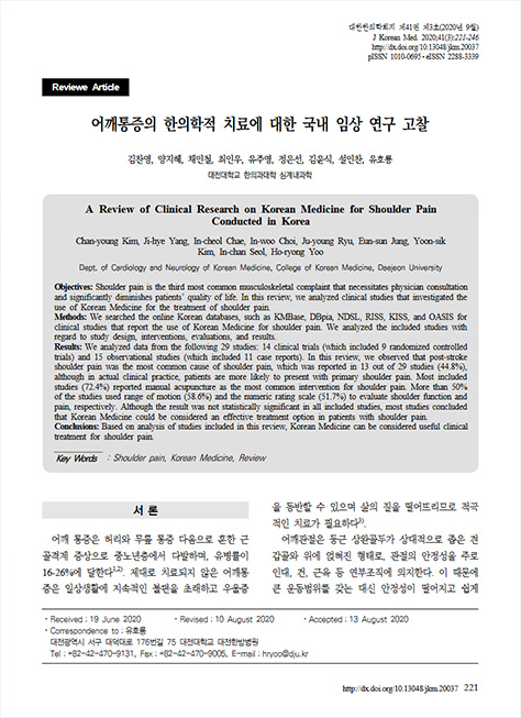 출처 | 국내에서 수행된 어깨 통증에 대한 한의학 임상 연구 검토 결과 어깨통증에 유용한 치료법이 됨을 검증한 논문