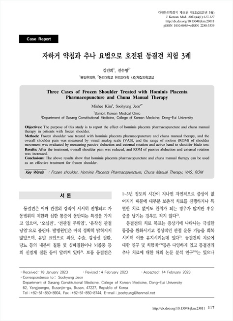 출처 | 자하거 약침과 추나치료로 오십견(동결견) 호전된 임상 논문