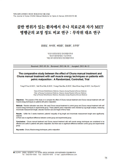 출처 | 골반 변위가 있는 환자에서 추나 치료군과 자가 MET 병행군의 교정 정도 비교 연구 : 무작위 대조 연구