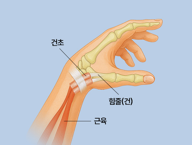 손목의 근육과 뼈를 연결하는 건을 둘러싸고 있는 건초 또는