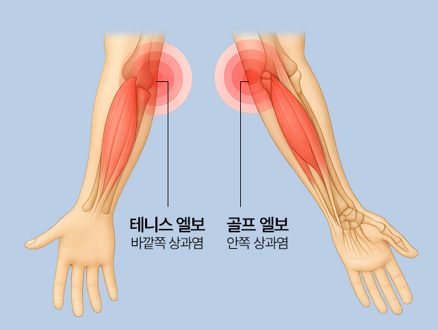 팔꿈치 바깥쪽 통증 질환은 테니스 엘보, 안쪽 통증은