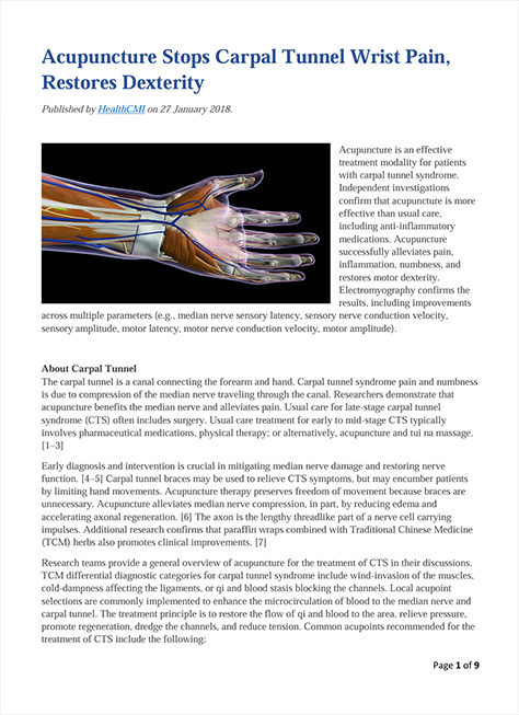 출처 | 손목터널증후군 환자 16주 침치료 + 한약 요법 vs. 소염진통제 비교 결과 침치료군에서 90%의 통증 호전율, 85%의 손목 기능 개선율, 반면 약물군은 각각 65%, 50% 개선됨을 보여준 논문