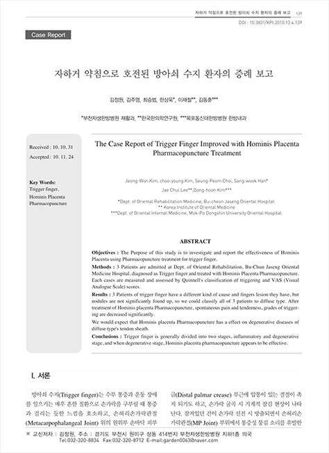 출처 | 방아쇠수지 환자들에게 자하거 약침 5~7회 치료 후 대부분의 환자에서 통증이 거의 사라지고 손가락 움직임이 정상에 가깝게 회복된 결과를 보여준 논문