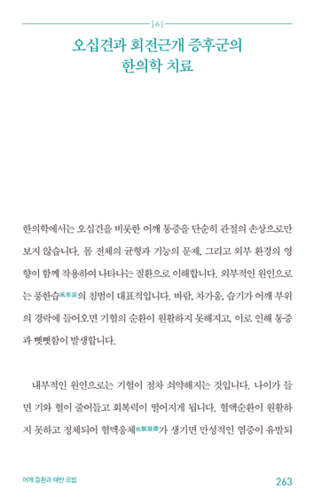 오십견(유착성 관절낭염), 회전근개 증후군, 어깨충돌 증후군 등의 개별 또는 동반된 환자 치료